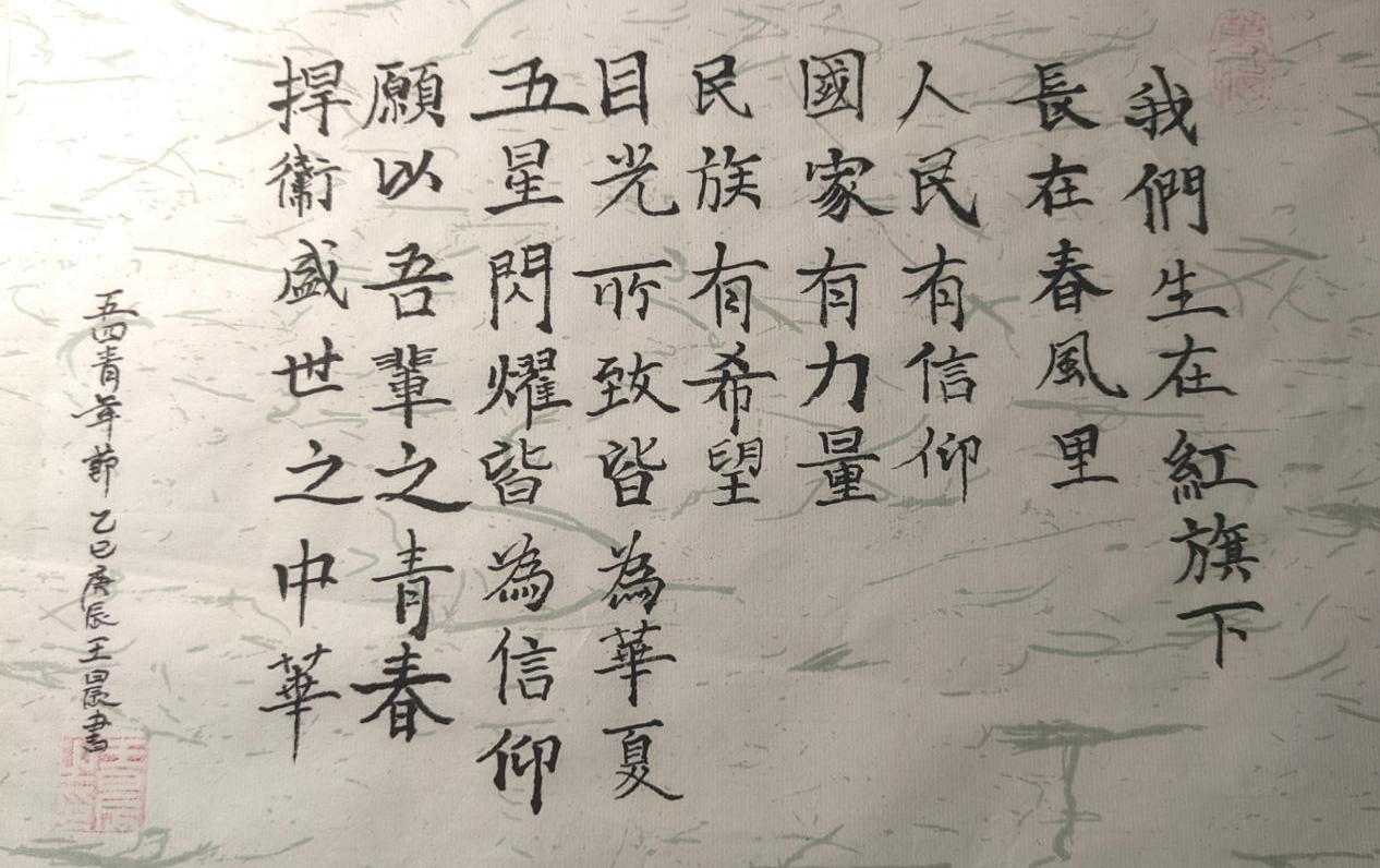 这幅书法作品,字句铿锵,饱含着深沉的爱国情怀与对五四精神的传承。“我们生在红旗下,长在春风里”,点明新时代青年优越的成长环境,是国家繁荣昌盛的见证者。“人民有信仰,国家有力量,民族有希望”,彰显出信仰对于国家和民族的重要意义。
